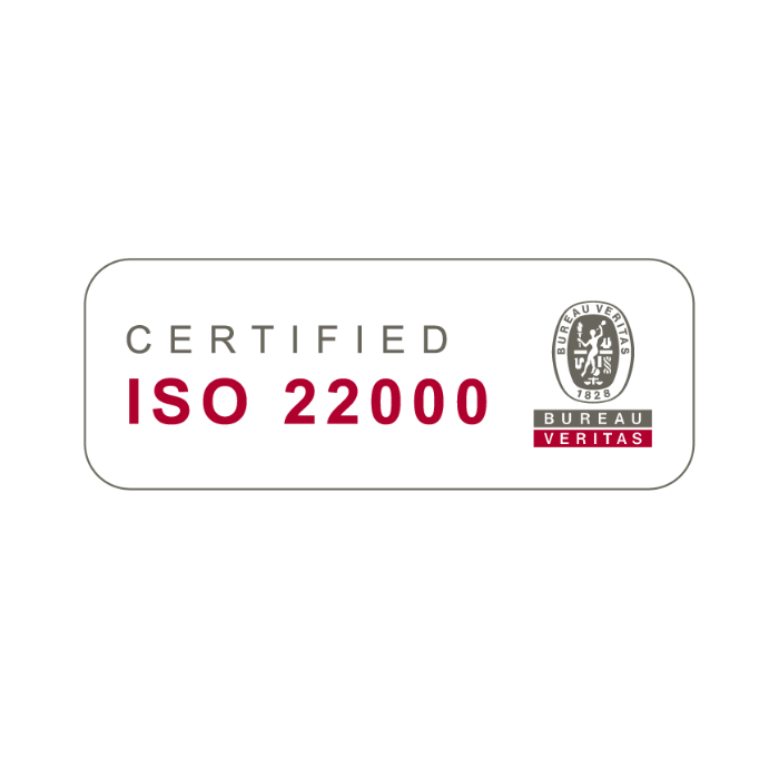 ISO 22000 guarantees food safety throughout the entire supply chain, ensuring that all our manufacturing and food handling processes meet safety standards.
